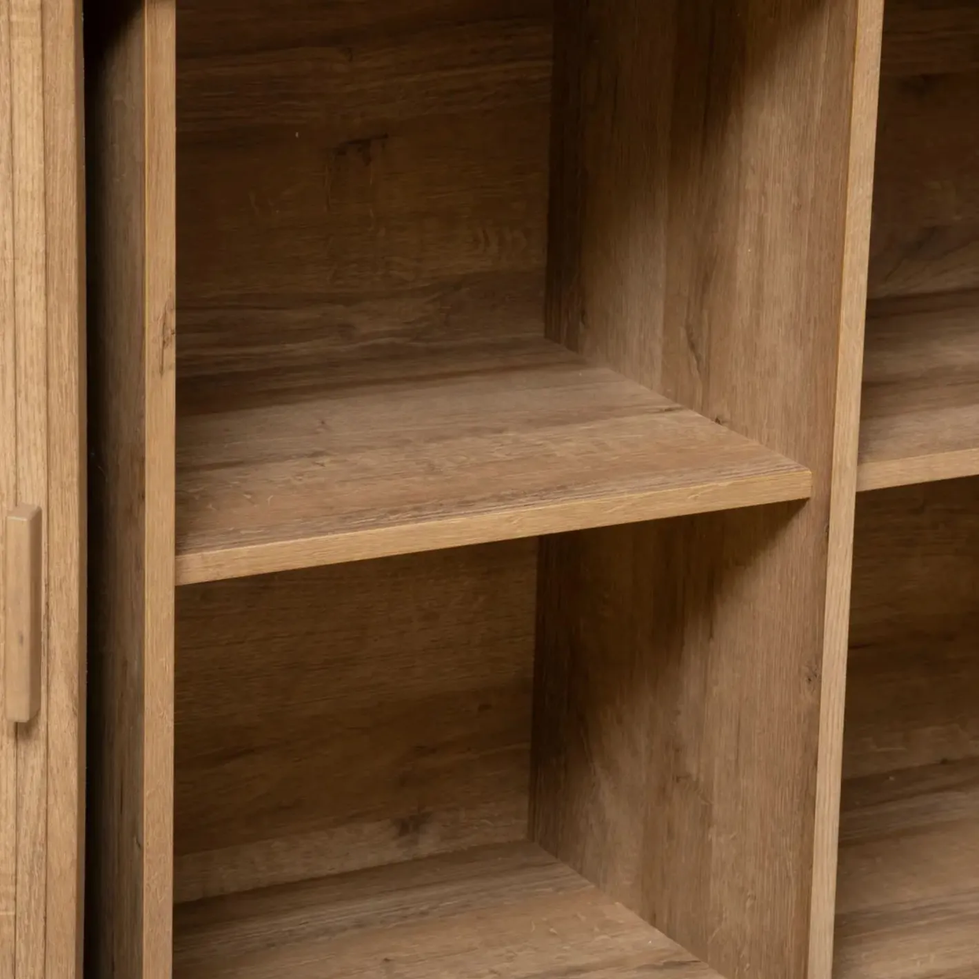 Con puertas correderas y con un interior equipado con 6 estantes para almacenar objetos y decorar con jarrones y portavelas.