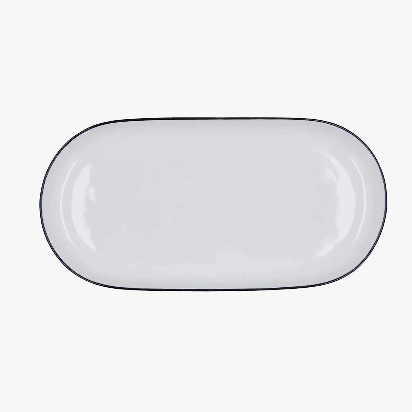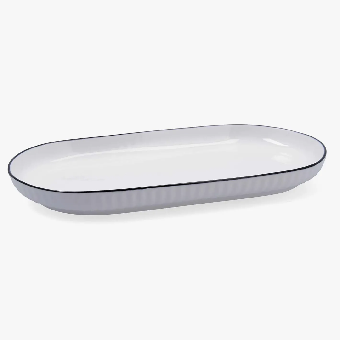 La bandeja oval Siena de 32x16cm destaca por su forma estilizada y su acabado en cerámica blanca con relieve y filo negro.