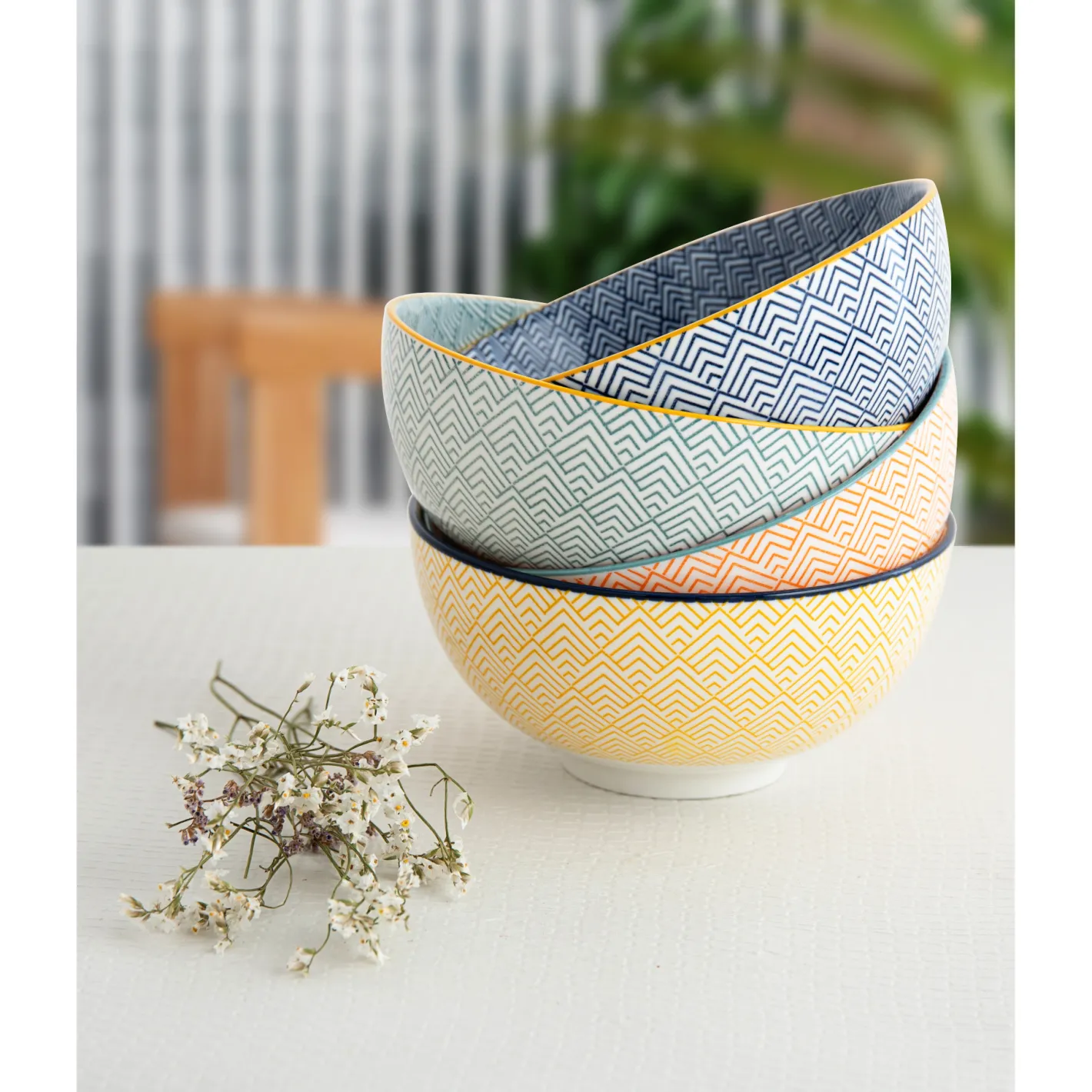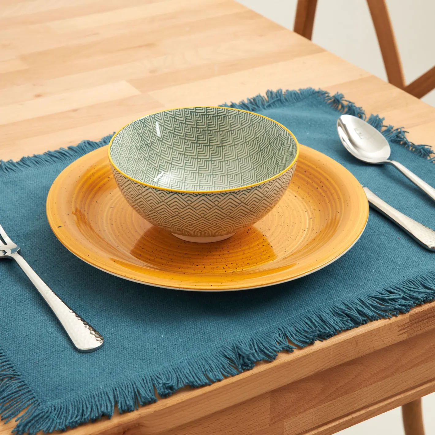 Estampado geométrico en colores vibrantes que destaca en cualquier mesa.