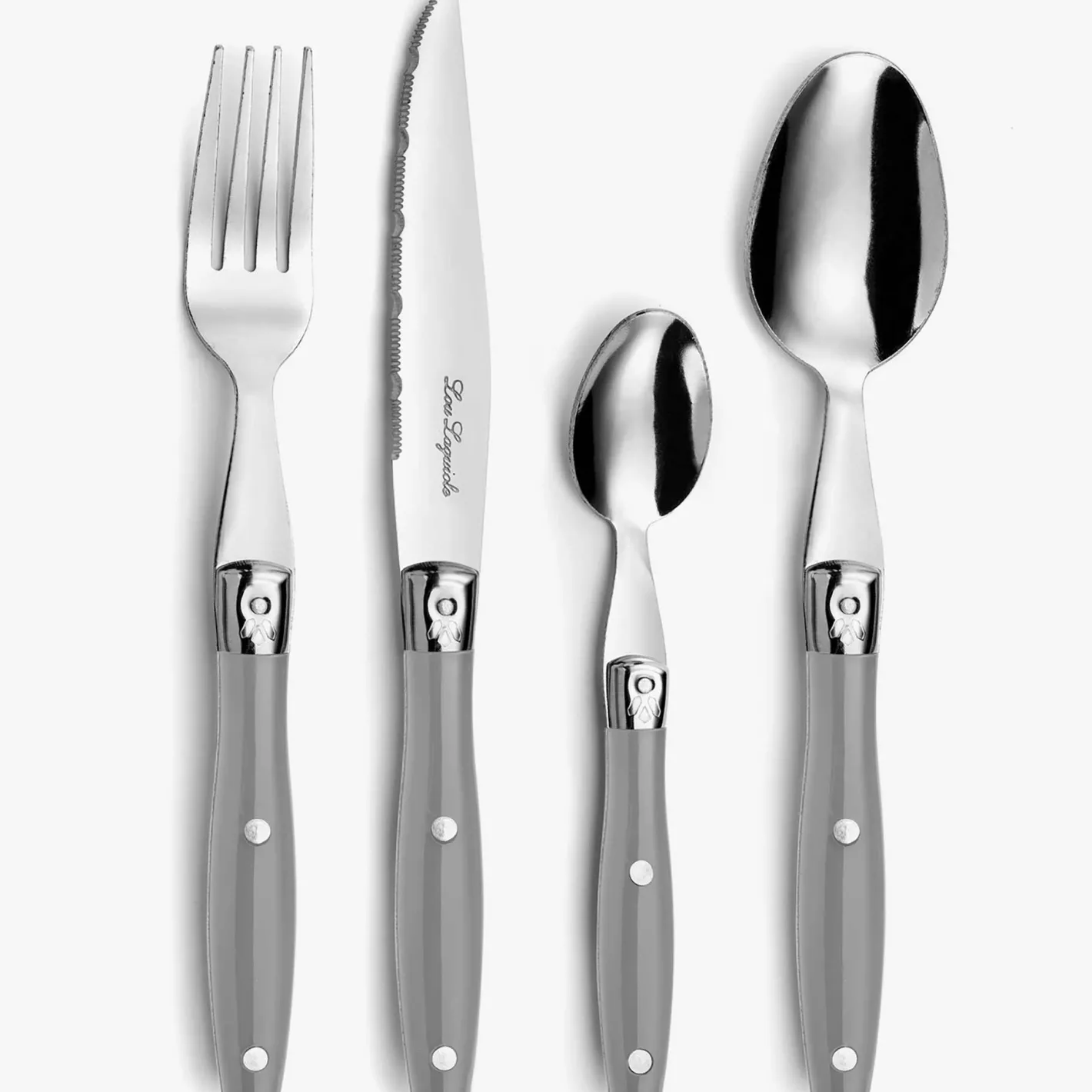 Su acabado en acero inoxidable con mangos gris pizarra aporta sofisticación a cualquier mesa.