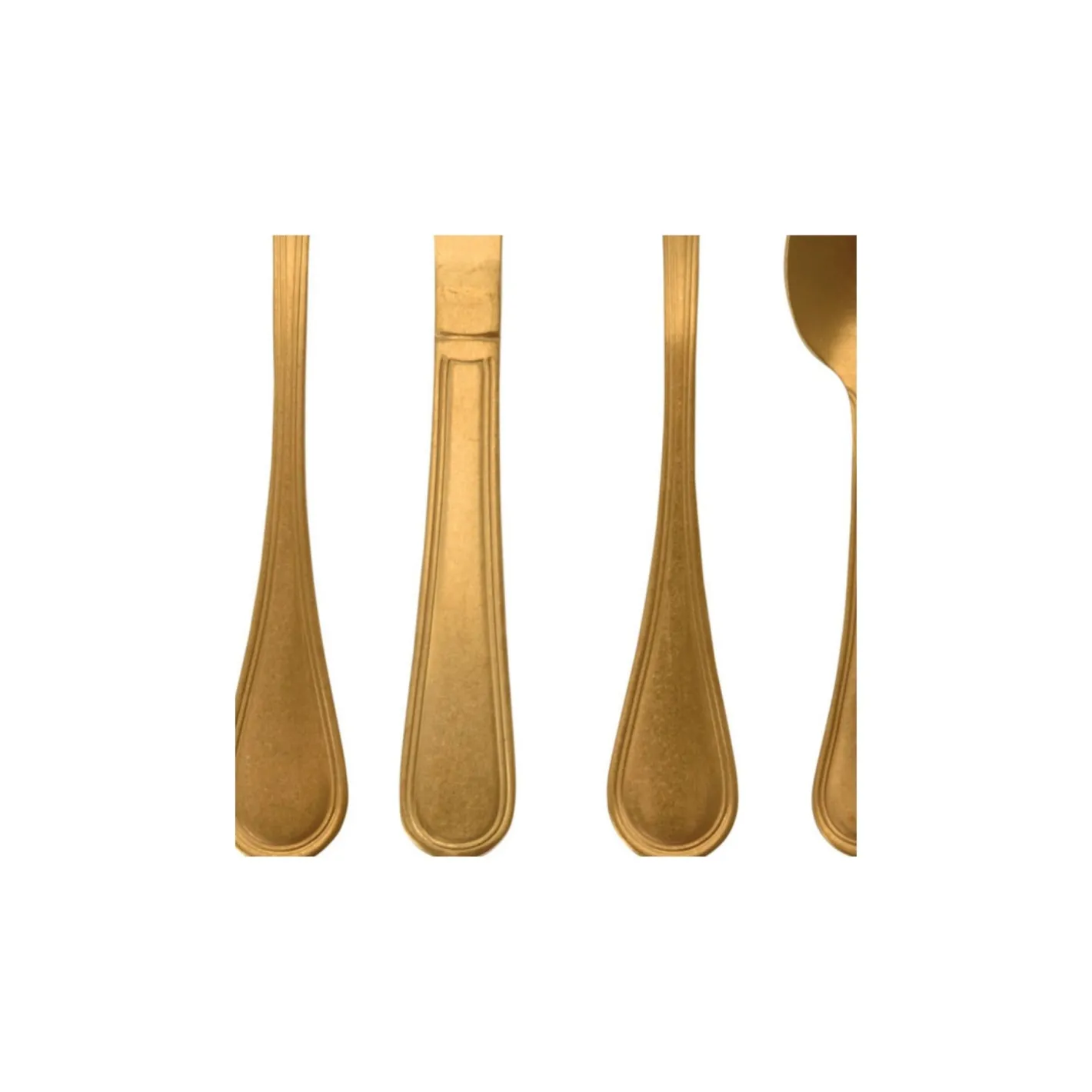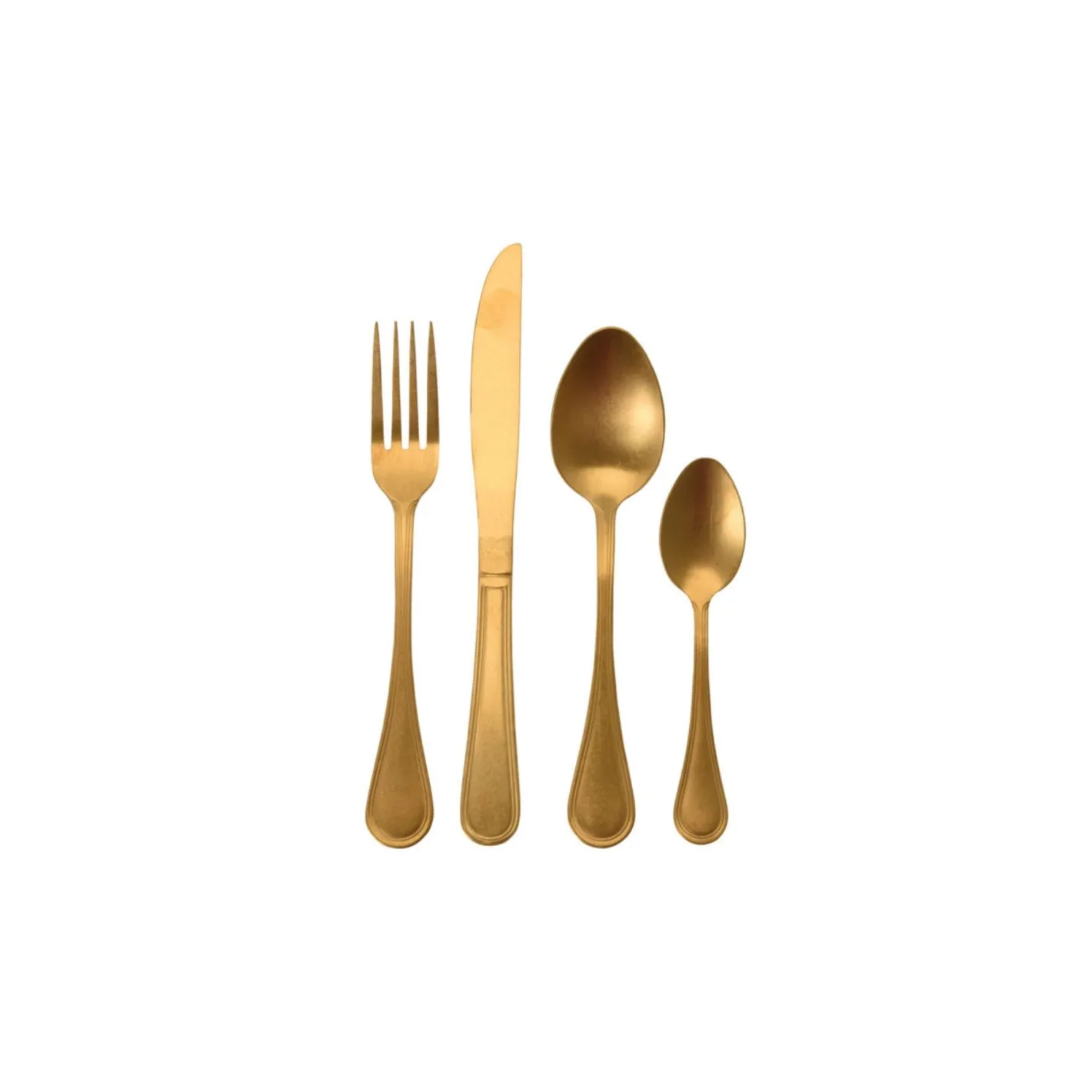 Eleva la presentación de tu mesa con esta cubertería de 16 piezas de acero inoxidable dorado.