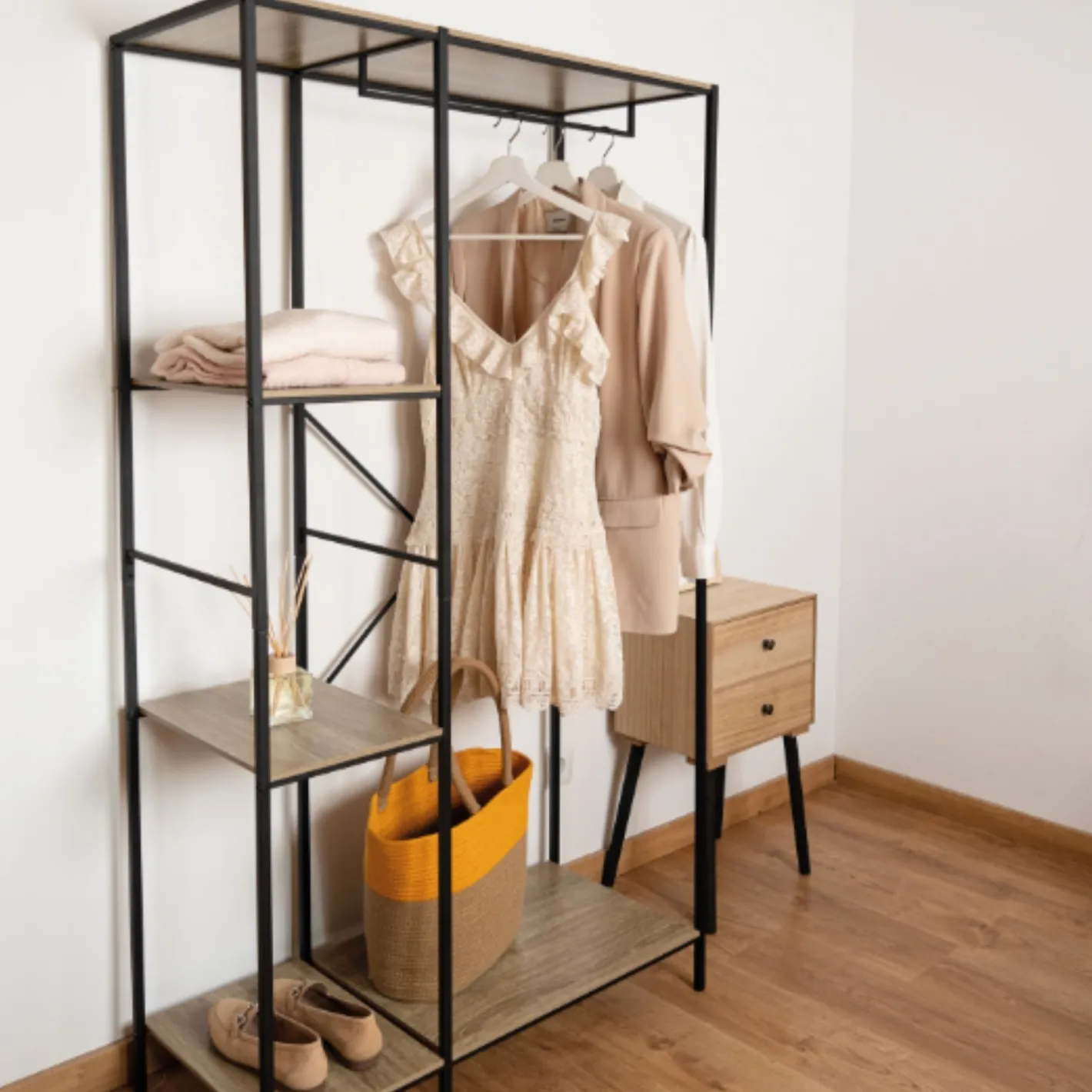 Combina una estructura sólida de acero acabado antioxidación, 2 baldas y 2 bases en MDF de alta resistencia.