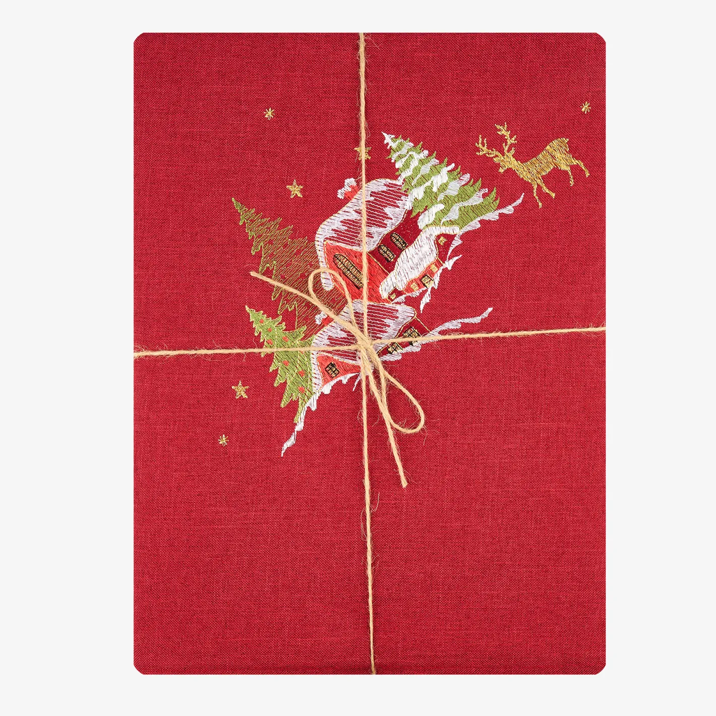 - Diseño: Mantel de 150x250cm en un cálido color rojo, con un delicado bordado que representa un pintoresco pueblo cubierto de nieve, perfecto para la decoración de tu mesa durante la Navidad.