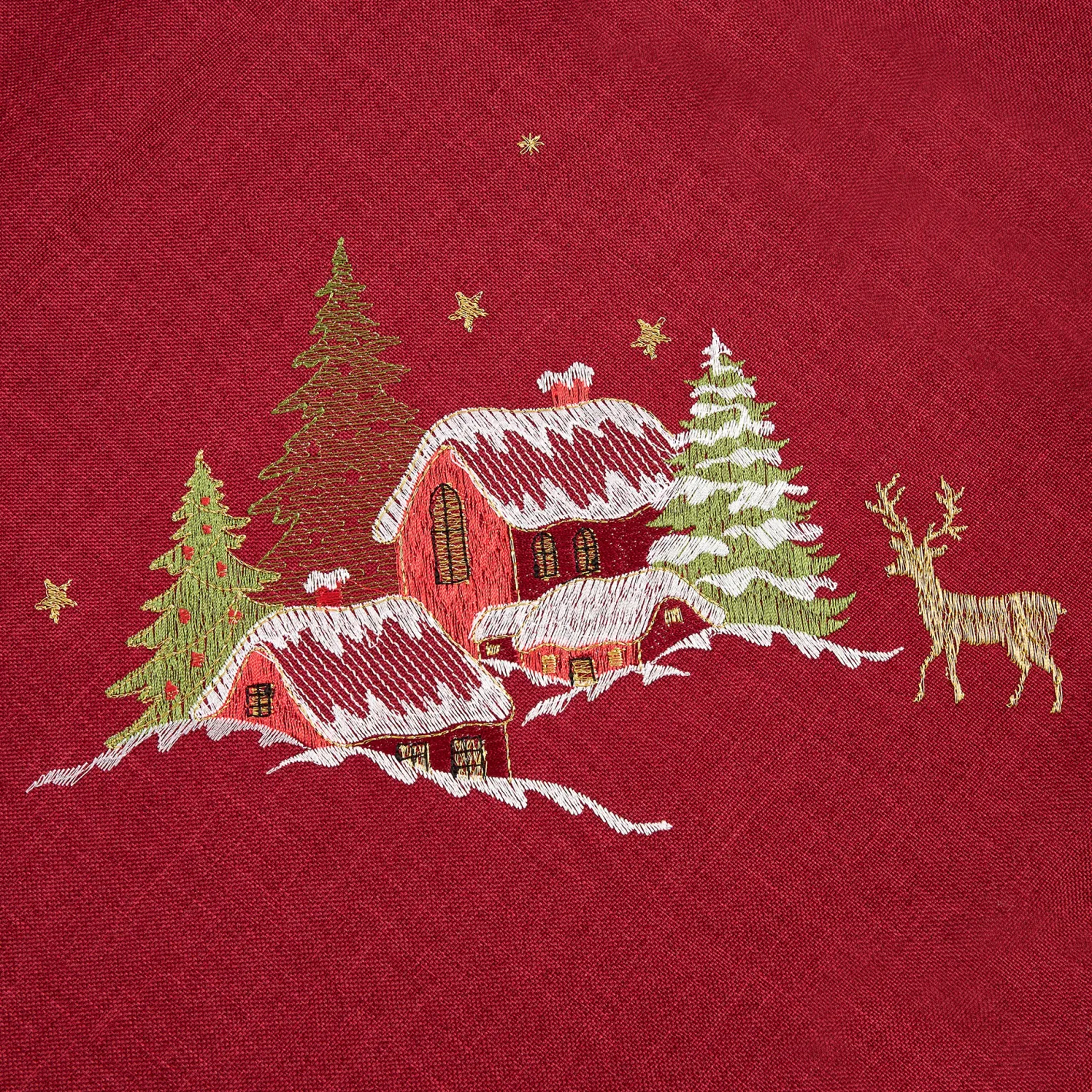 Añade un toque de magia navideña a tu mesa con este mantel rojo, adornado con un encantador bordado de un pueblo nevado.