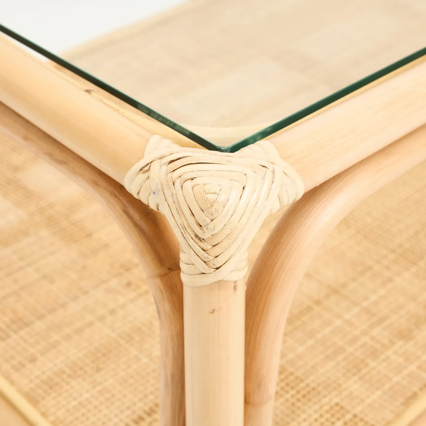La transparencia del cristal permite que la belleza del tejido de ratán debajo brille, creando una sensación de ligereza y amplitud en el espacio.