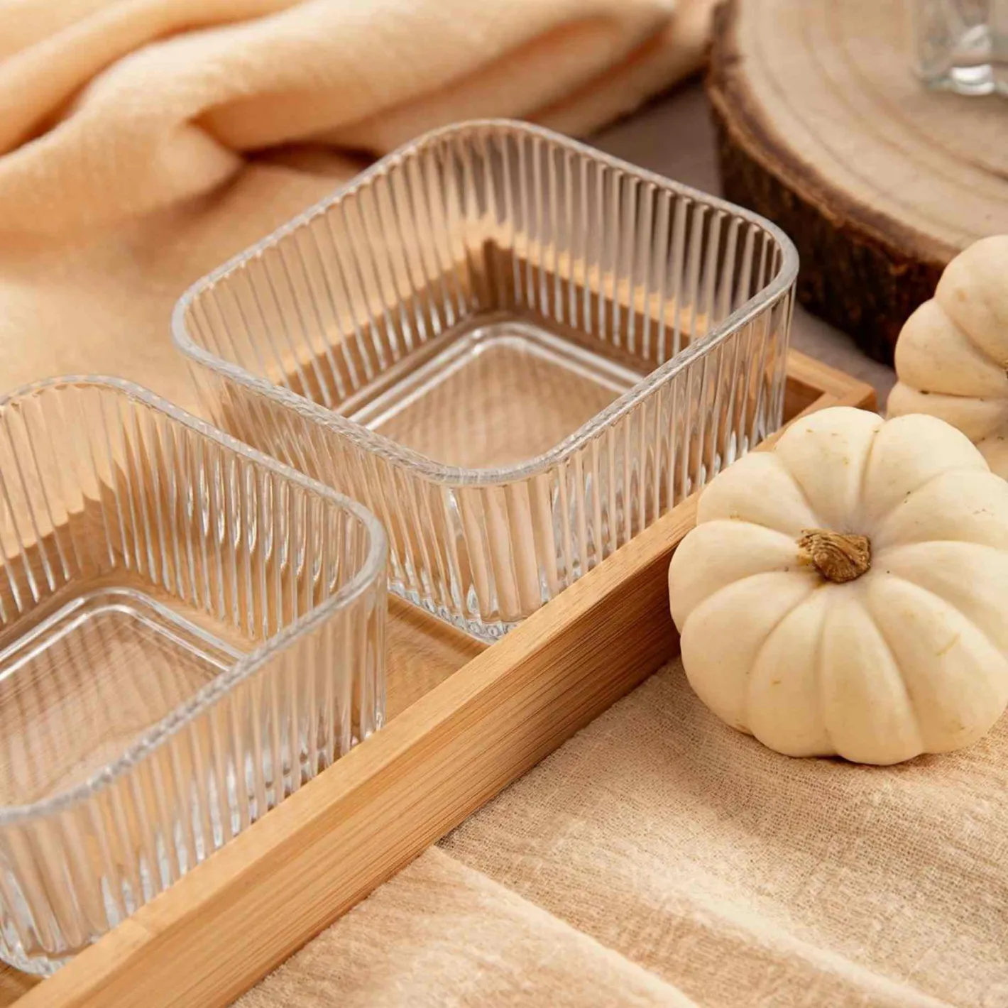 - Materiales de calidad: Cuencos de vidrio resistente con acabado facetado y bandeja de bambú natural.
