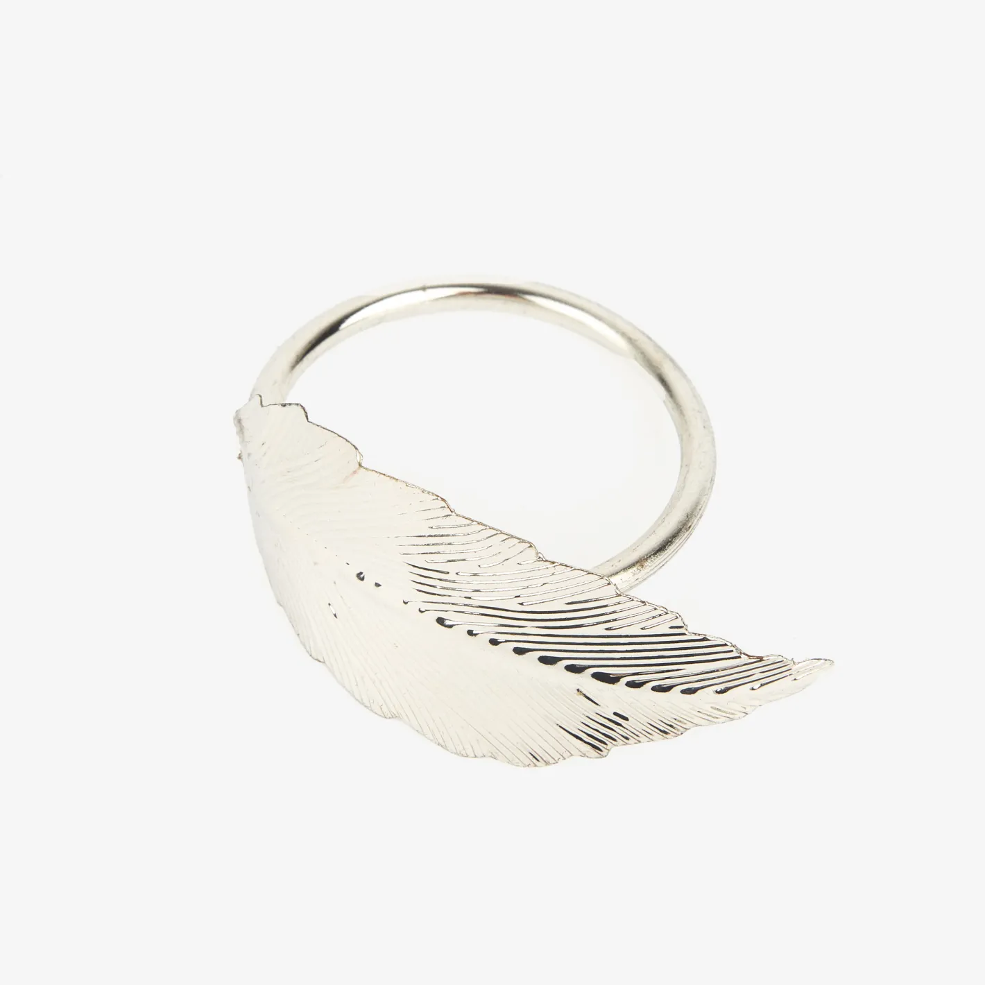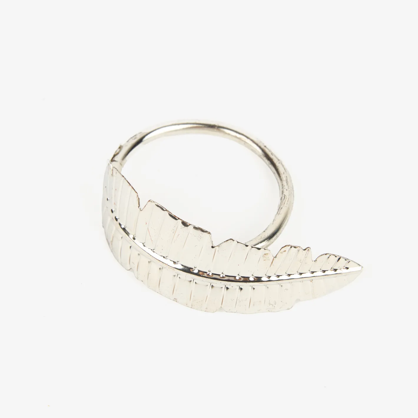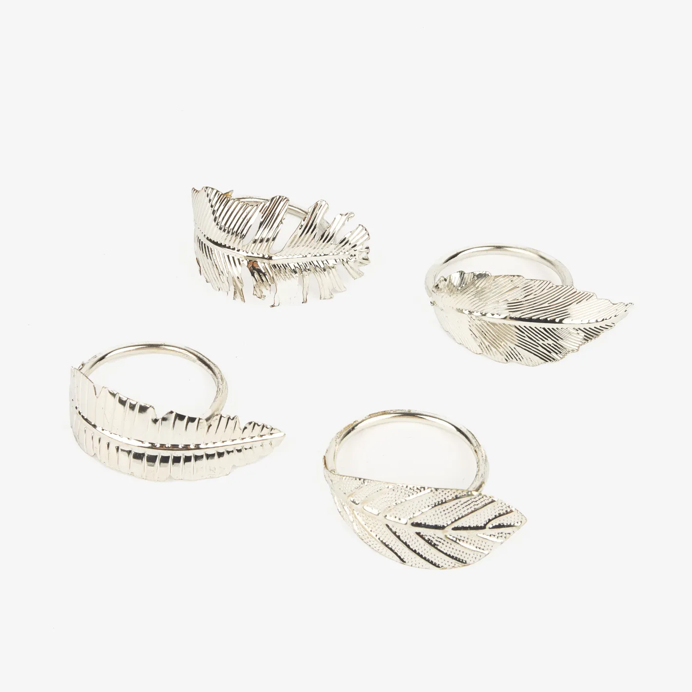 Este elegante set de 4 servilleteros de metal en color plateado con diseño de pluma es el complemento ideal para vestir tu mesa con estilo y sofisticación.