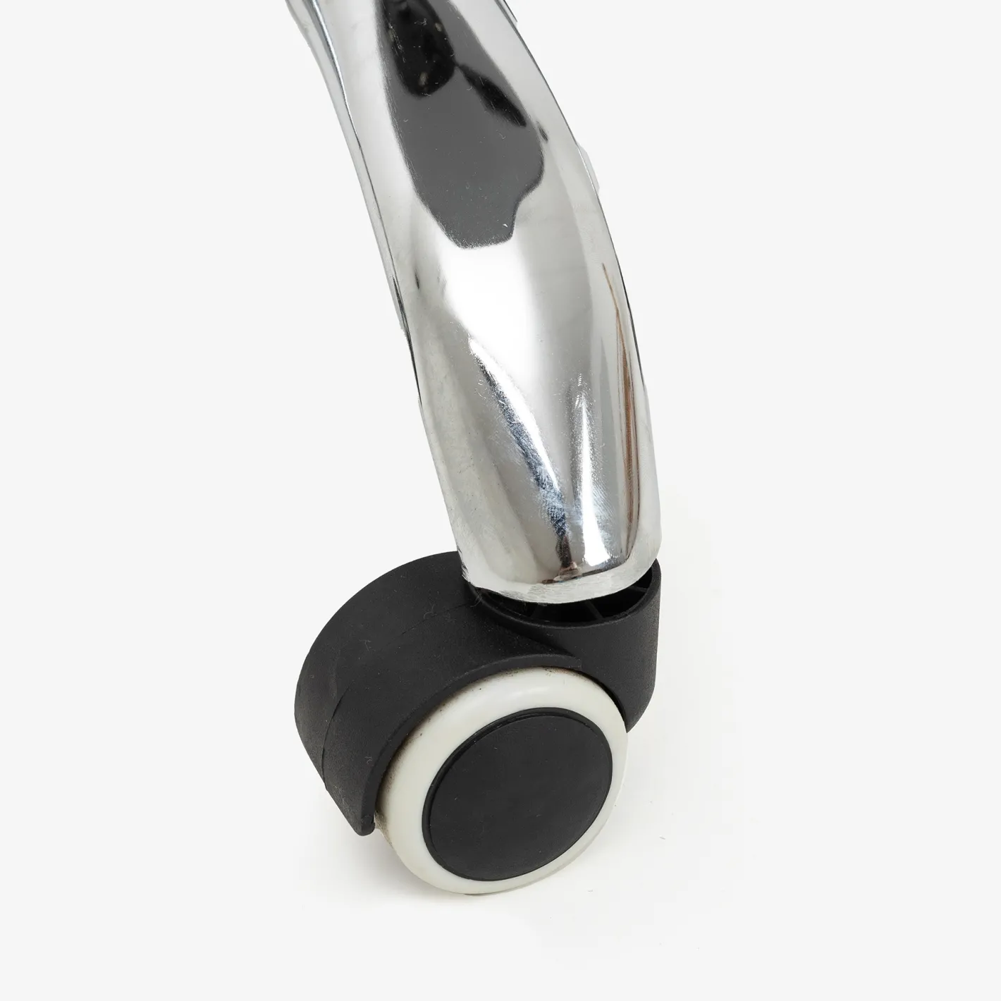 - Base estable: Estructura metálica cromada con cinco ruedas para un desplazamiento fluido.