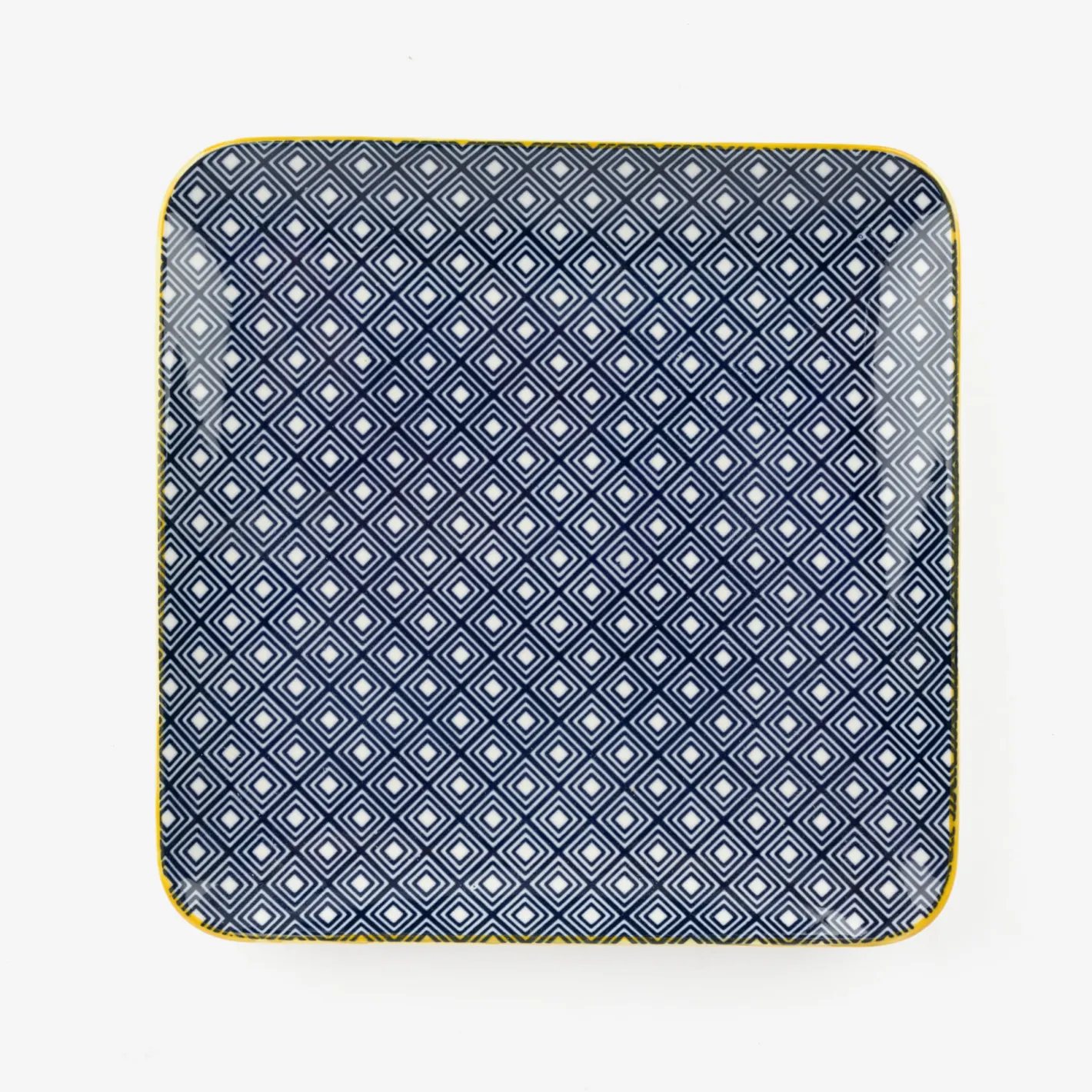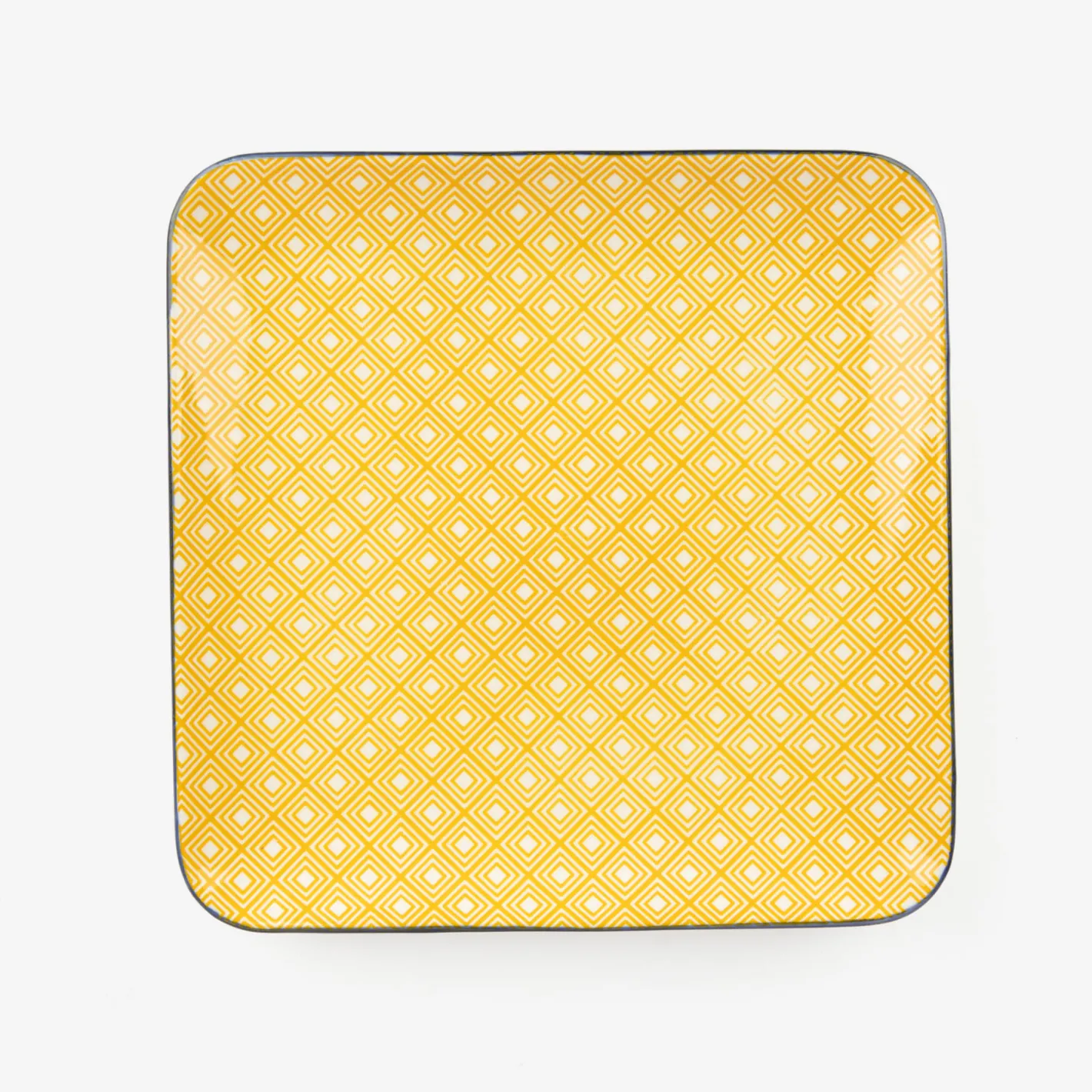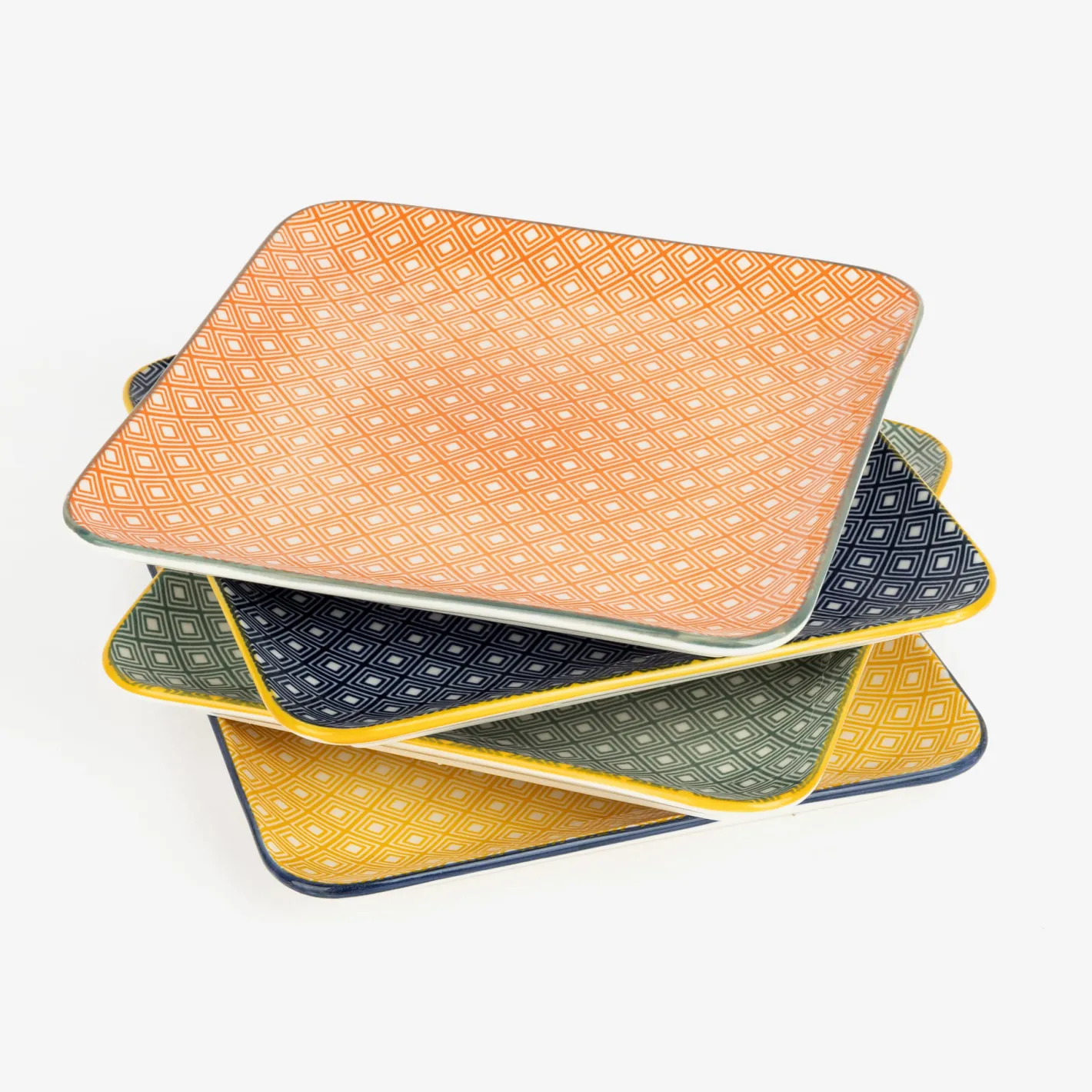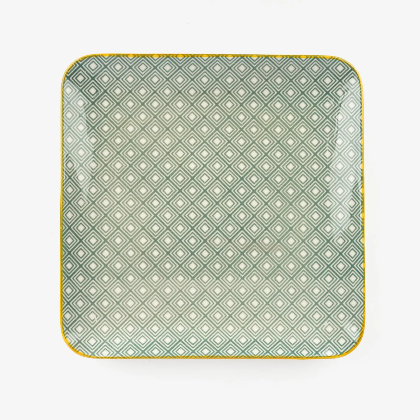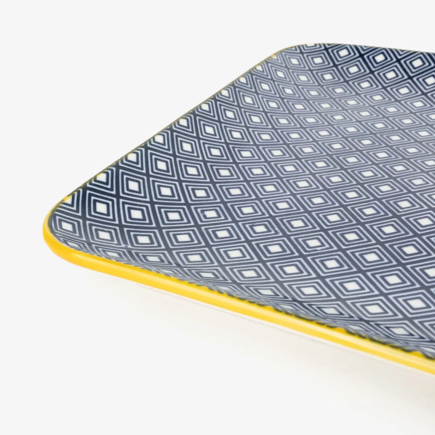 Con un diseño geométrico y tonos vibrantes, esta bandeja es ideal para servir aperitivos, postres o pequeños platos.