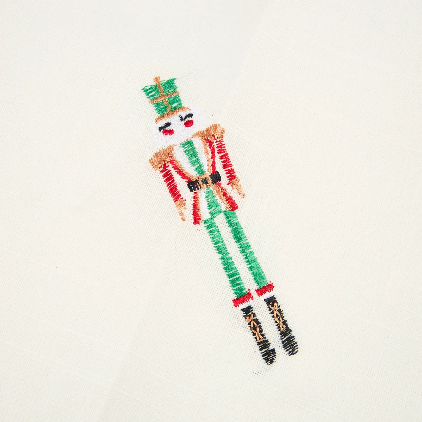 - Diseño: Servilleta de 45x45cm en color blanco, adornada con un delicado bordado de Cascanueces que evoca el encanto de la Navidad.