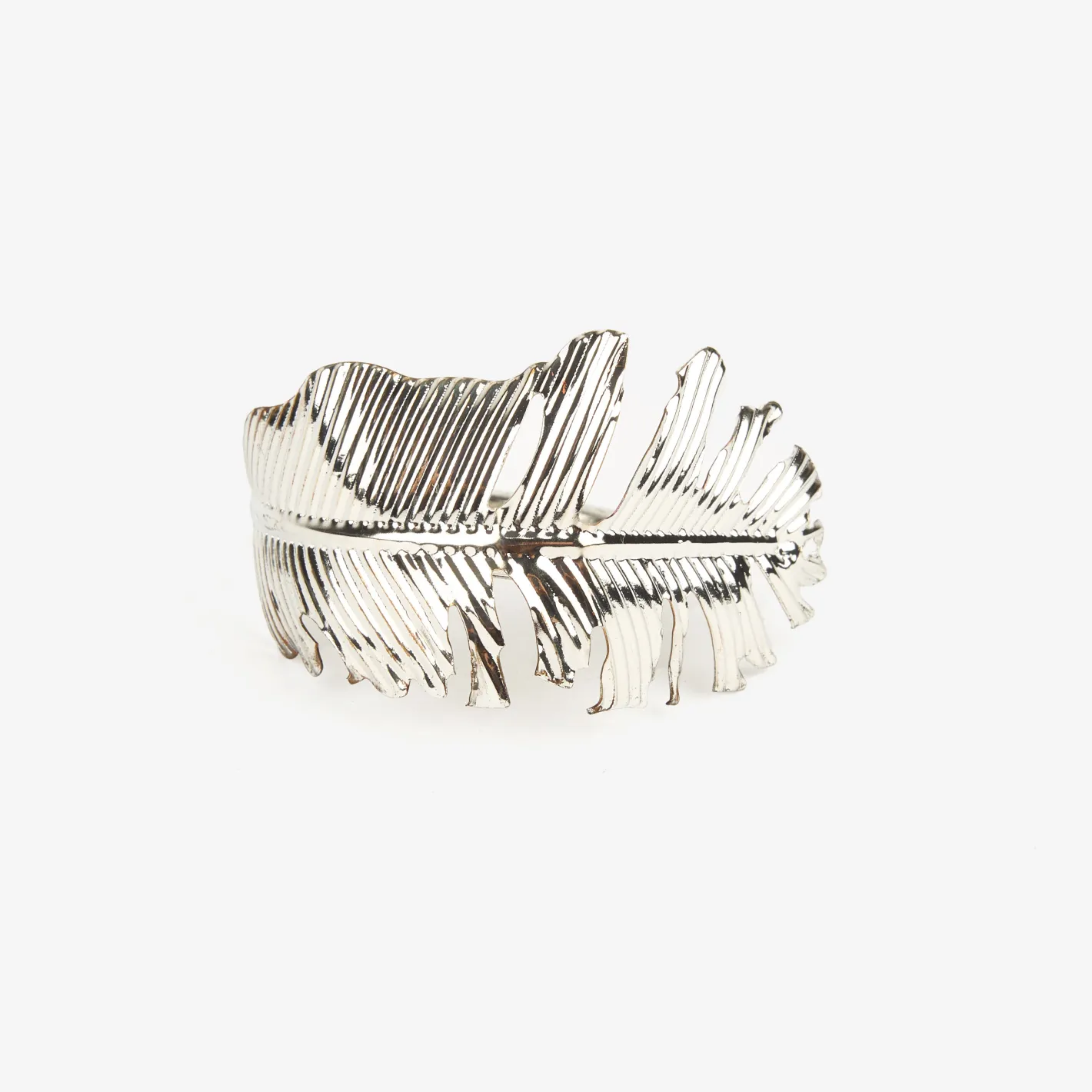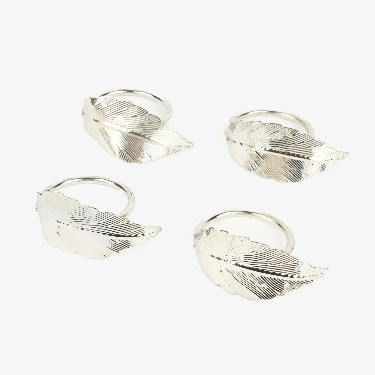 Este elegante set de 4 servilleteros de metal en color plateado con diseño de pluma es el complemento ideal para vestir tu mesa con estilo y sofisticación.