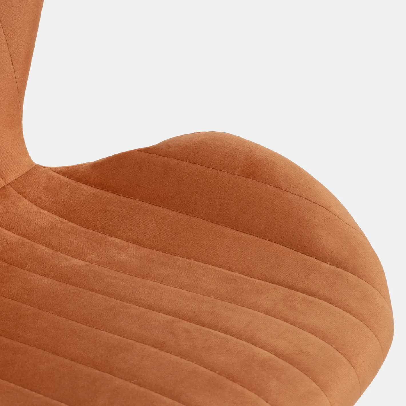 Su tapizado en terciopelo naranja aporta suavidad y un acabado sofisticado, ideal para comedores modernos o clásicos.
